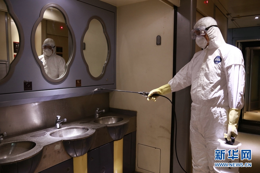 工作人員對(duì)每一列旅客列車進(jìn)行消毒作業(yè)。新華網(wǎng) 郝寶君 攝