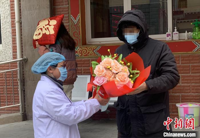 醫(yī)護人員向走出隔離病區(qū)的降某送上鮮花?!⒅铱?攝