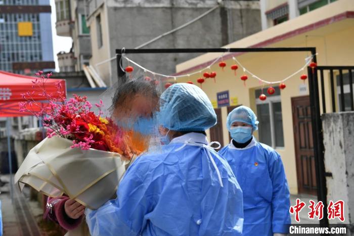 醫(yī)護(hù)人員向郭某某送上鮮花?!≈芡?攝