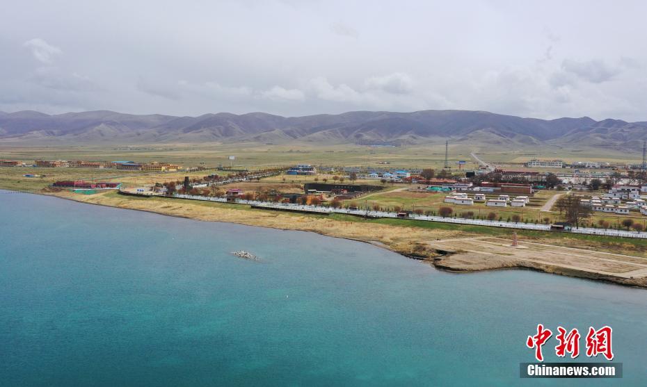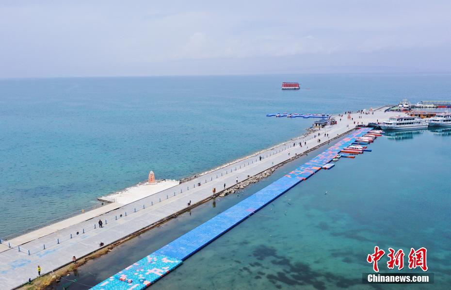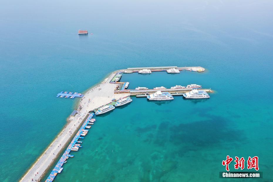 5月19日,航拍被碧綠湖水包圍的青海湖二郎劍景區(qū)碼頭。初夏時(shí)節(jié),青海省海南藏族自治州青海湖畔萬(wàn)物復(fù)蘇,碧水藍(lán)天,宛如油畫(huà)。中新社記者 馬銘言 攝