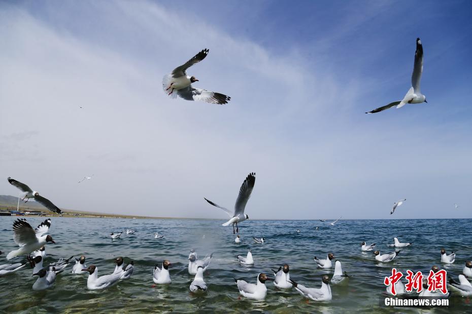 5月19日,水鳥(niǎo)在青海湖自由翱翔。初夏時(shí)節(jié),成群的魚(yú)鷗、斑頭雁等多種水鳥(niǎo)在青海省海南藏族自治州青海湖景區(qū)內(nèi)自由翱翔,嬉戲玩耍,吸引游客前來(lái)觀賞。中新社記者 馬銘言 攝