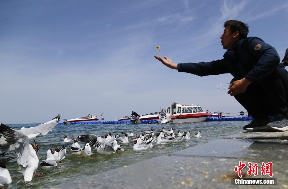 5月19日,一位游客在青海湖二郎劍景區(qū)內(nèi)給水鳥(niǎo)喂食。當(dāng)日是中國(guó)旅游日,游客在青海省海南藏族自治州青海湖二郎劍景區(qū)內(nèi)乘船觀湖、與水鳥(niǎo)互動(dòng)、感受初夏青海湖的海天一色之美。中新社記者 馬銘言 攝