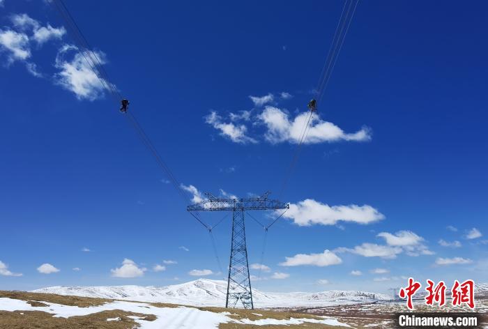 4月下旬,在海拔3100米的甘肅省甘南藏族自治州合作市根沙村,天空還時(shí)不時(shí)飄雪。在青豫工程甘肅段施工現(xiàn)場(chǎng),施工人員站在80米高的鐵塔上施工。(資料圖) 夏露 攝