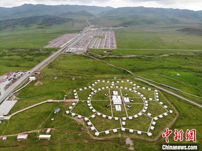 尕秀村的帳篷城由108頂大小各異的藏式風格帳篷組成??罩懈╊?,一頂頂帳篷如同一顆顆璀璨的珍珠,點綴著曬銀灘草原的秀美。楊艷敏 攝