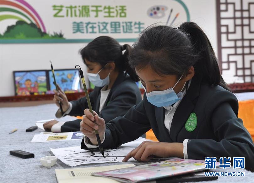 四川省阿壩藏族羌族自治州九寨溝縣九寨溝小學(xué)(原漳扎鎮(zhèn)小學(xué))的學(xué)生在上國(guó)畫(huà)課(6月18日攝)。 新華社記者 劉坤 攝