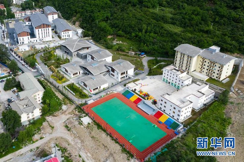 這是四川省阿壩藏族羌族自治州九寨溝縣九寨溝小學(xué)(原漳扎鎮(zhèn)小學(xué))和九寨溝縣第二人民醫(yī)院(后)(無(wú)人機(jī)照片,6月18日攝)。 新華社記者 沈伯韓 攝