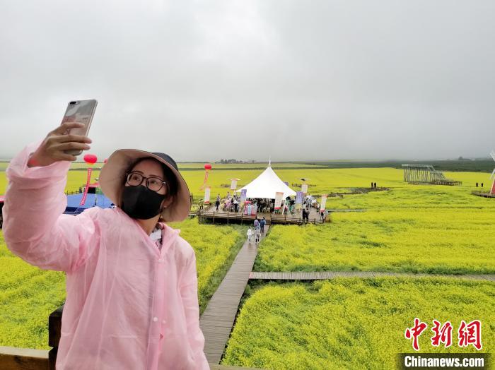 記者在油菜花海內(nèi)看到,雖然當(dāng)天下著雨,仍然有前來游玩的游客,當(dāng)?shù)厥忻褛w金花說,疫情后這是他們一家人第一次來油菜花海游玩,走在一望無際的花海里心情特別輕松。