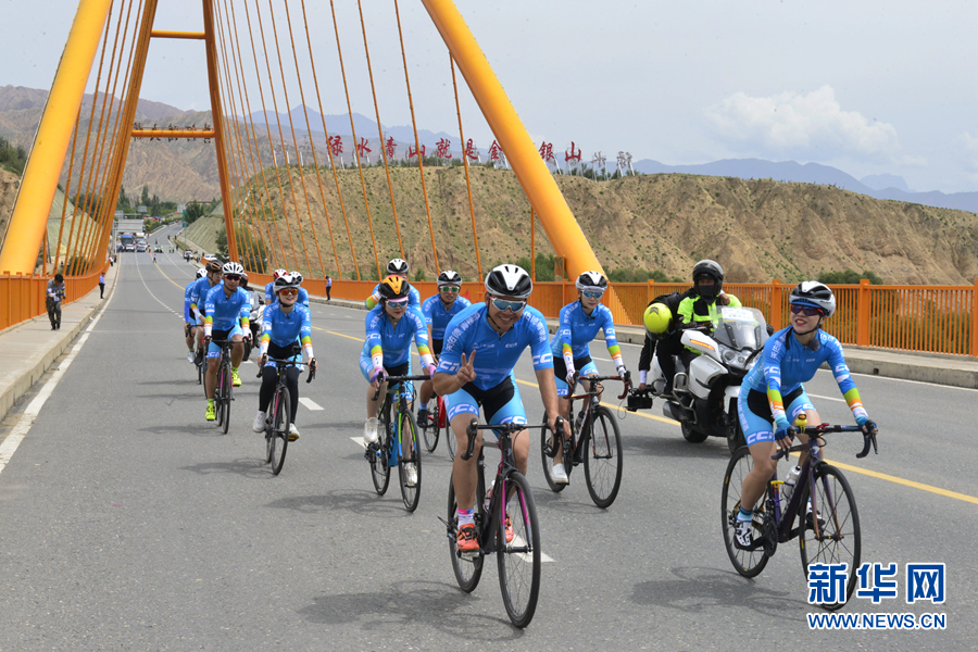 圖為“網(wǎng)紅”團(tuán)隊(duì)在貴德黃河大橋上騎行。新華網(wǎng) 魚昊 攝