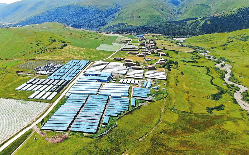 8月19日航拍的阿壩縣高原中低溫食用菌基地。該基地年創(chuàng)產(chǎn)值達(dá)2500余萬(wàn)元,常年解決貧困農(nóng)牧民就業(yè)200余人。肖雨楊 攝