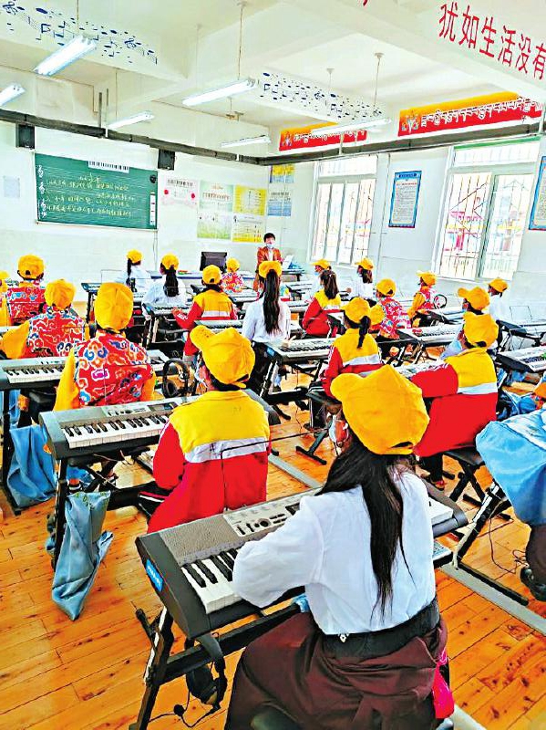 甘孜州理塘縣城關(guān)第四完全小學(xué)音樂(lè)室,孩子們正在學(xué)習(xí)彈奏電子琴。張庭銘 攝