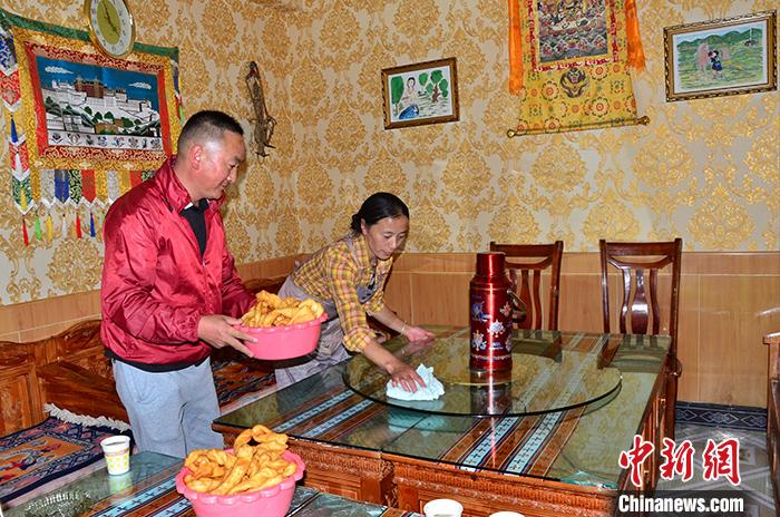 圖為8月20日扎西夫婦倆為客人準(zhǔn)備晚餐。 中新社記者 魯?shù)り?攝