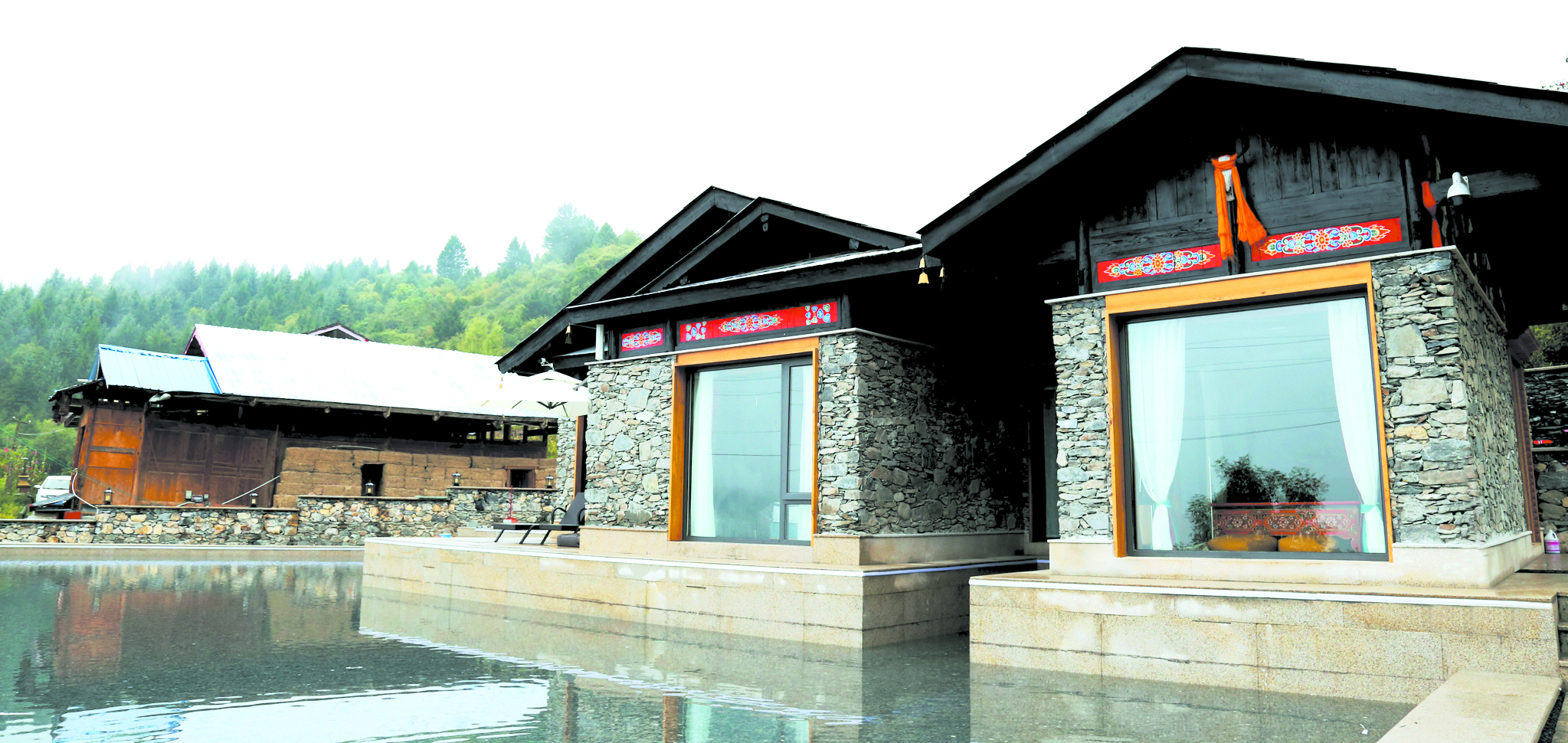 往前方望去,山勢(shì)起伏,云海翻卷,氣象萬(wàn)千;往身后看,現(xiàn)代氣息的落地窗與石條砌墻灰瓦覆頂,結(jié)合藏式文化元素的新藏寨,在屋前環(huán)繞的水面倒映下,一個(gè)未來(lái)網(wǎng)紅打卡地呼之欲出。