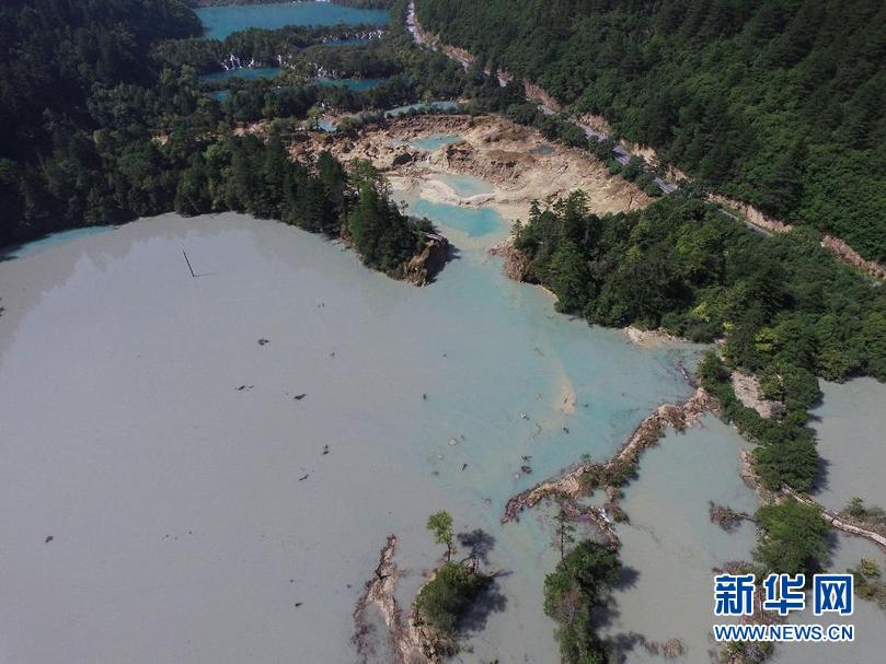 這是2017年九寨溝遭遇地震后的火花海景點(2017年8月9日攝,無人機照片)。新華社發(fā)