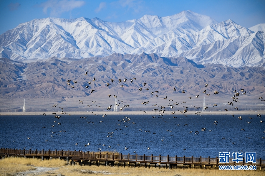 天光云影,百鳥翔集,一群赤麻鴨在都蘭湖國(guó)家濕地公園上空飛翔。(11月21日攝)新華網(wǎng) 潘彬彬 攝