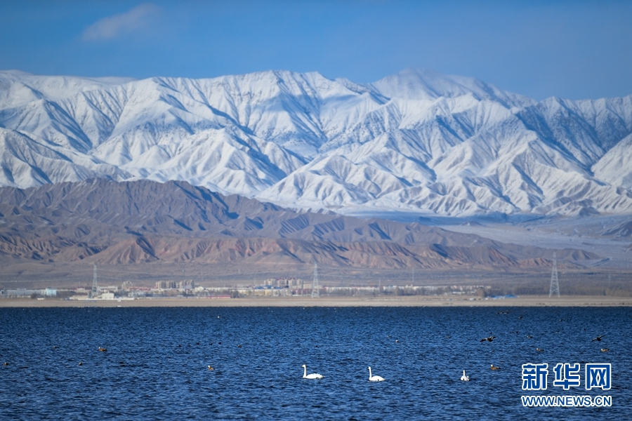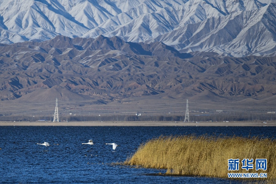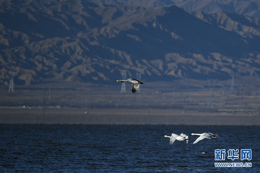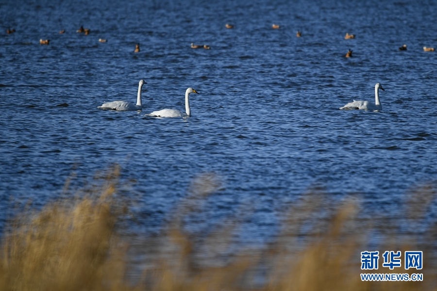 大天鵝、赤麻鴨在都蘭湖游弋。(11月21日攝) 新華網(wǎng) 潘彬彬 攝