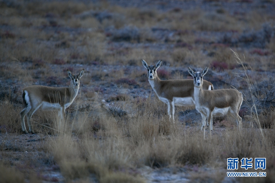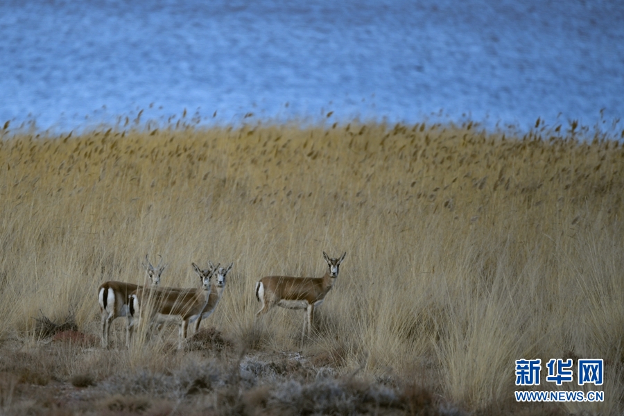 四只鵝喉羚在都蘭湖國(guó)家濕地公園內(nèi)活動(dòng)。(11月21日攝)新華網(wǎng) 潘彬彬 攝