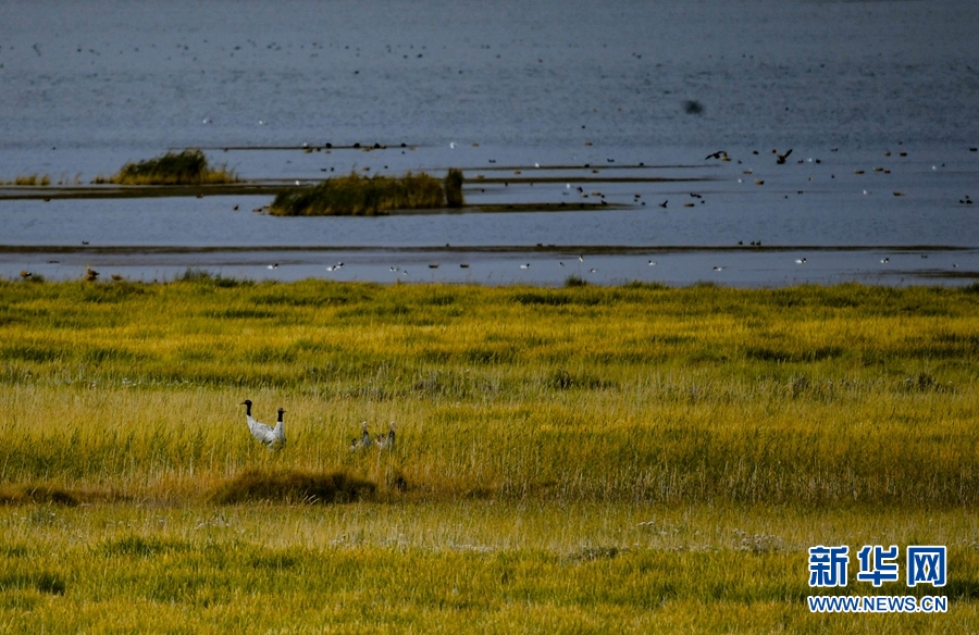 生活在都蘭湖國(guó)家濕地公園內(nèi)的黑頸鶴一家。(9月24日攝)新華網(wǎng) 潘彬彬 攝