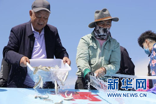6月6日,當?shù)厝罕妼⑶嗪:沲庺~苗投放到布哈河。新華社記者 周喆 攝
