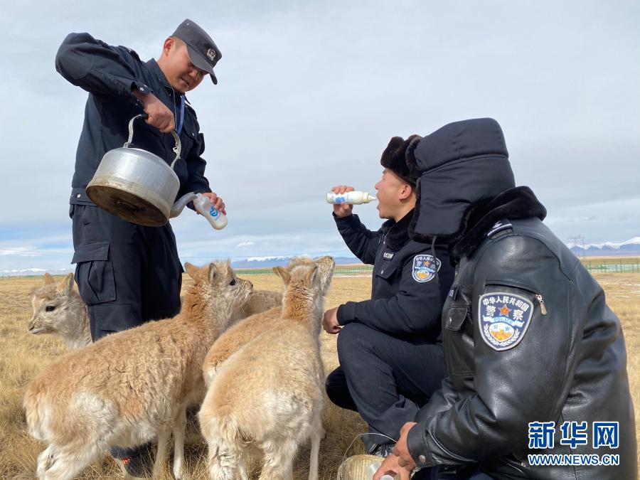 12月7日,在給藏羚羊幼仔喂奶前,可可西里索南達(dá)杰保護站站長趙新錄(中)用嘴測試奶溫。新華社記者 王金金 攝