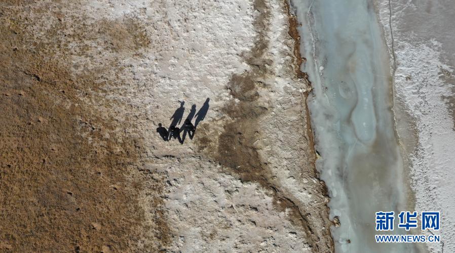 12月7日,站長趙新錄(中)與隊友鄧海平(左)、達(dá)才在可可西里索南達(dá)杰保護站管護區(qū)域內(nèi)巡查(無人機照片)。新華社記者 王艷 攝