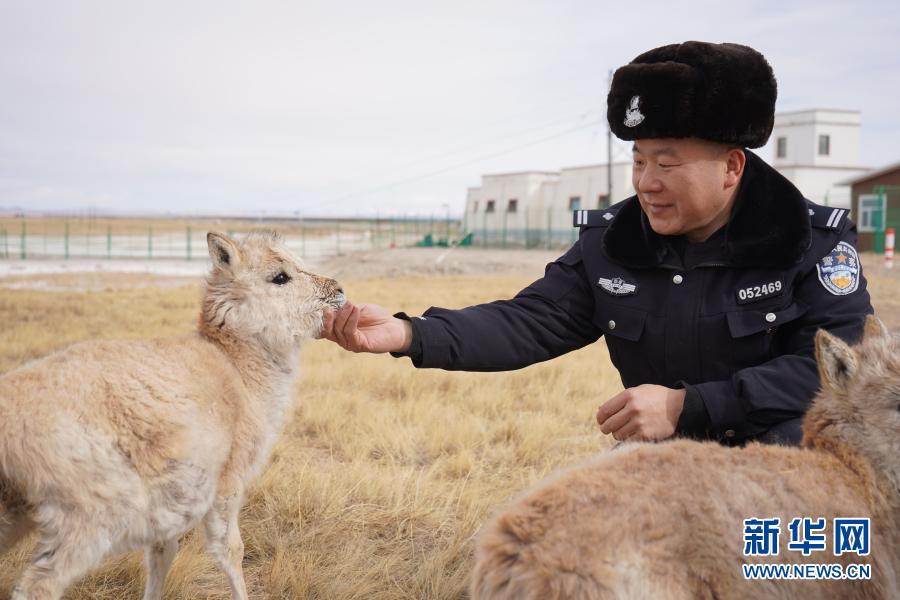 12月7日,可可西里索南達(dá)杰保護站站長趙新錄在撫摸藏羚羊幼仔。新華社記者 藍(lán)翔 攝