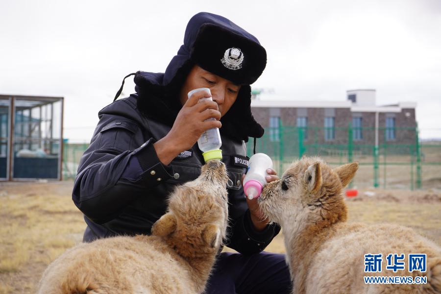 可可西里巡山隊員鄧海平給藏羚羊幼仔喂奶(12月6日攝)。新華社記者 王金金 攝