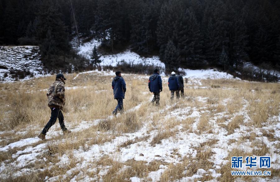 12月8日,祁連山國家公園扎麻什管護站生態(tài)管護員昂旦才讓(右一)和同伴們在巡護途中。新華社記者 張宏祥 攝