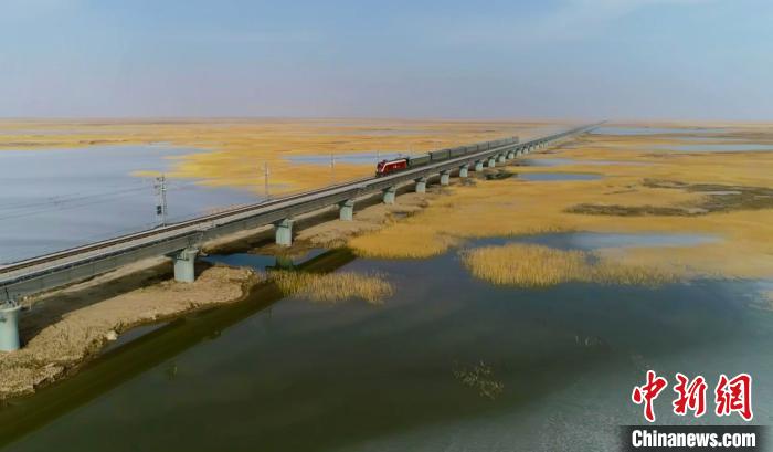 列車經(jīng)過臺特瑪湖特大橋。若羌縣融媒體中心供圖