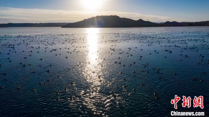 圖為上萬只野生鳥類在湖中游蕩。烏席勒 攝