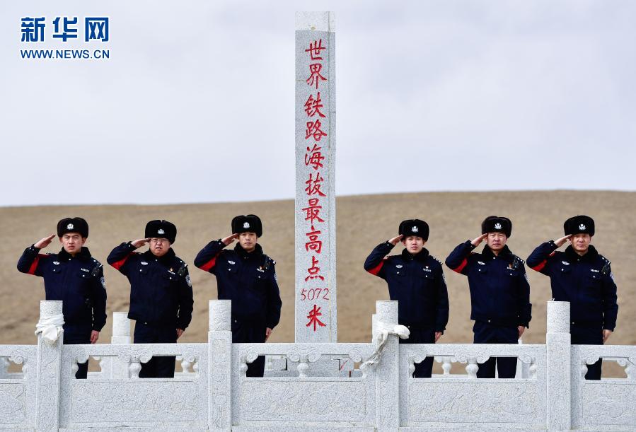2月4日,沱沱河站派出所巡線民警在“世界鐵路海拔最高點(diǎn)”標(biāo)志碑前合影。新華社記者 張龍 攝