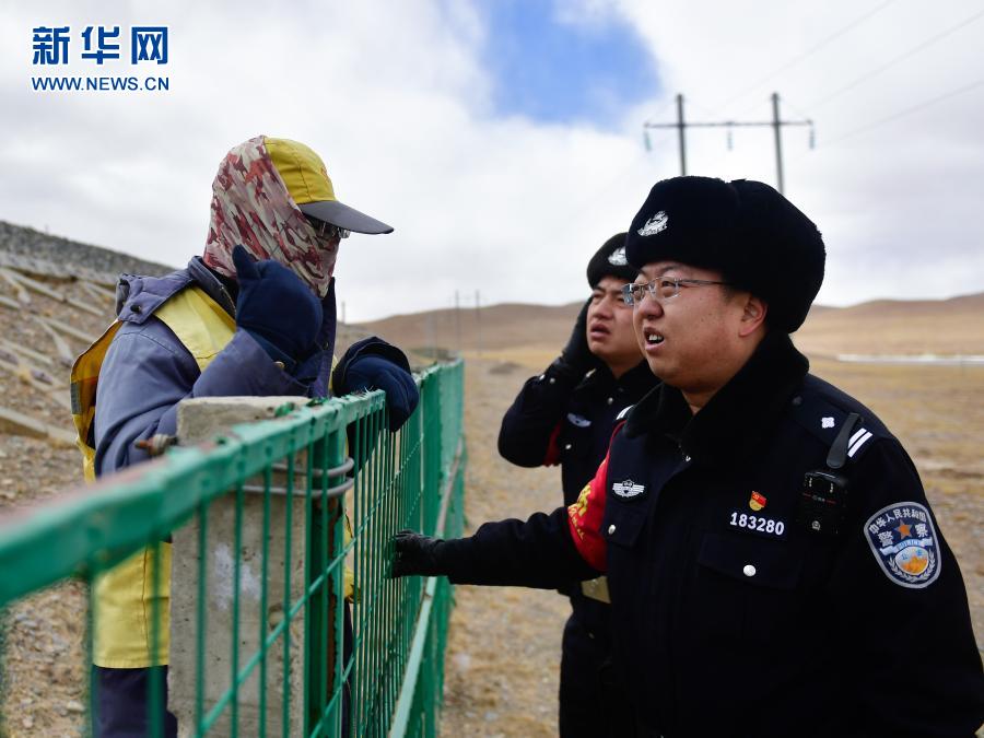 2月4日,沱沱河站派出所巡線民警田長(zhǎng)松(右)在巡線途中向青藏鐵路公司格爾木工務(wù)段唐古拉線路車間養(yǎng)路工人了解情況。新華社記者 張龍 攝