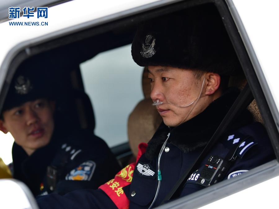 2月5日,沱沱河站派出所副所長(zhǎng)蒲海春(右)在巡線途中出現(xiàn)高原反應(yīng)后緊急吸氧。新華社記者 張龍 攝
