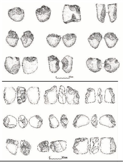 石核—石片技術(shù)是人類最早發(fā)明和使用的打制石器技術(shù),在我國(guó)距今兩百多萬(wàn)年至一萬(wàn)年左右舊石器時(shí)代有較為豐富的發(fā)現(xiàn)。它是用一件堅(jiān)硬圓鈍的石塊(石錘)打擊另一件石塊(石核)的邊緣,在石核邊緣剝離下帶有鋒利刃緣的片狀坯材(石片)。石核—石片工業(yè)的石核剝片模式可以有多種分類方式,如按臺(tái)面數(shù)量可以分為單臺(tái)面石核、雙臺(tái)面石核與多臺(tái)面石核;按剝片面數(shù)量可以分為單面剝片、雙面剝片、多面剝片與盤(pán)狀石核剝片等。