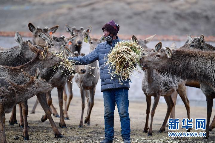 3月13日,甘德縣崗龍鄉(xiāng)恰不將村生態(tài)畜牧業(yè)專業(yè)合作社村民在鹿場喂鹿。新華社記者 張龍 攝