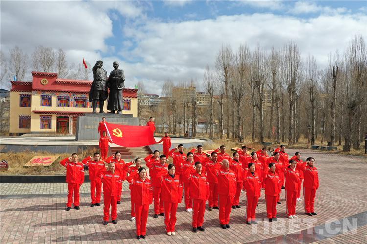 圖為在朱德總司令與五世格達活佛紀念館前重溫入黨誓詞