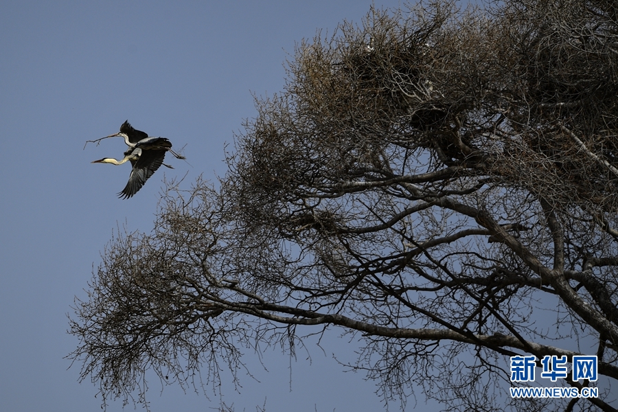 兩只蒼鷺來回飛舞忙碌建巢。新華網(wǎng) 卡婭梅朵 攝