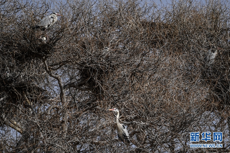 兩只蒼鷺在樹梢嬉戲。新華網(wǎng) 宋忠勇 攝