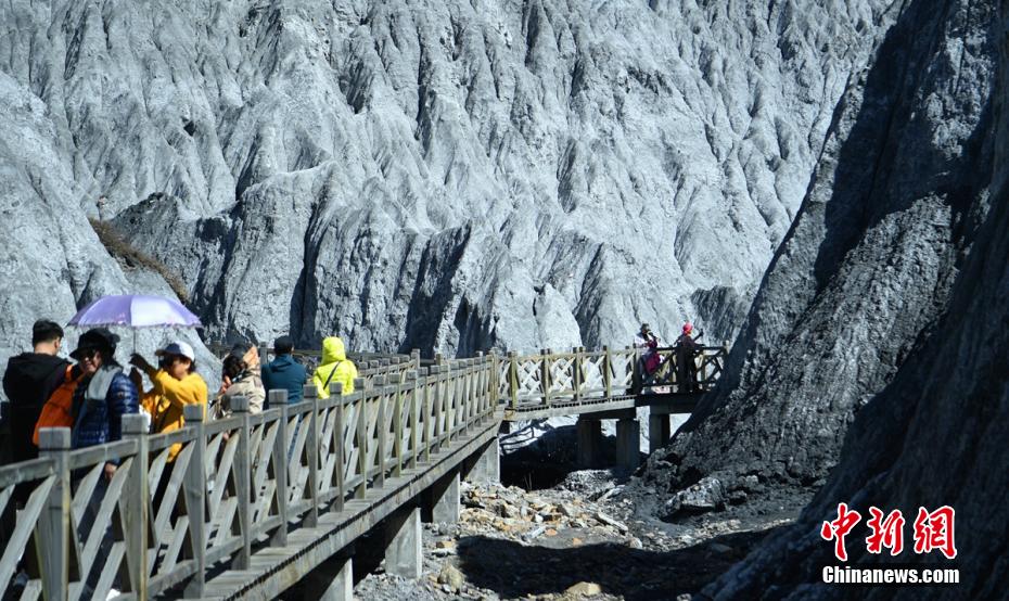 游人通過棧道進(jìn)入“土石林”深處。劉忠俊 攝