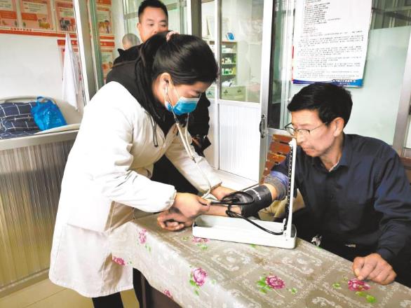 郭拉村衛(wèi)生室村醫(yī)給村民量血壓。 李雪萌 攝