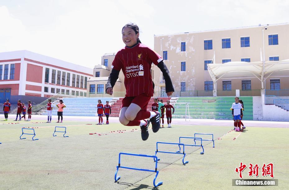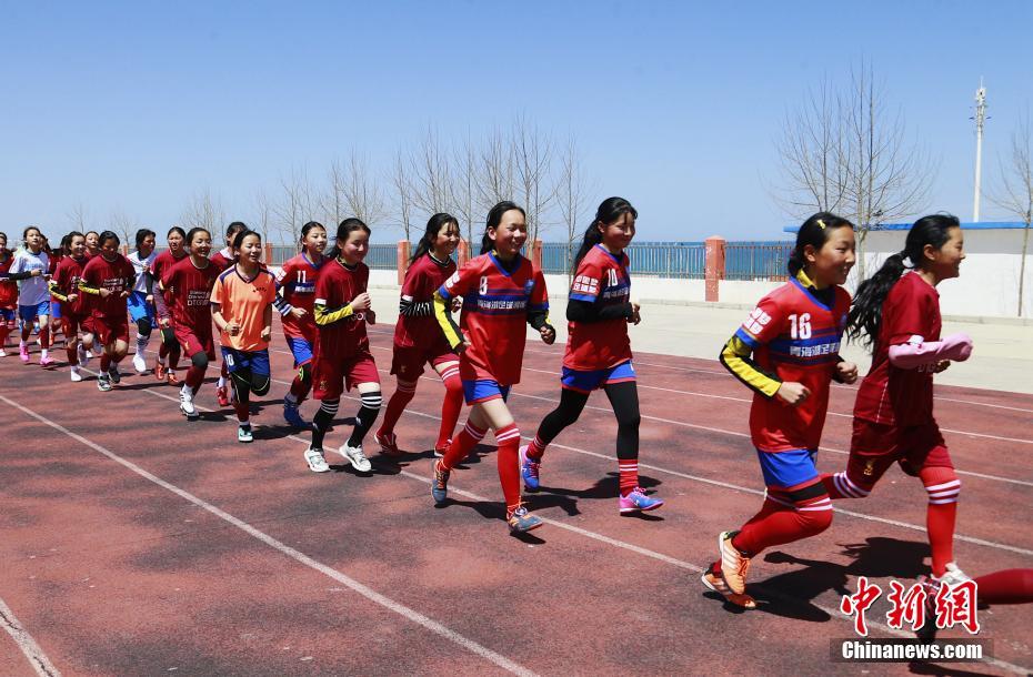 青海湖民族寄宿制學(xué)校的足球場上,女子足球隊(duì)的隊(duì)員們正在進(jìn)行跑步熱身。中新社記者 馬銘言 攝