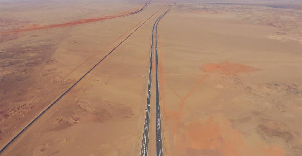 俯瞰穿越戈壁的京新高速公路額濟納旗段。新華社記者 鄧華 攝