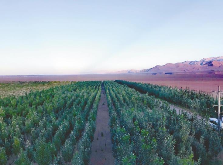 跟隨柴達木防沙治沙公司員工深一腳、淺一腳地走在治沙基地田埂上,一排排在田間地頭栽植的林木,為農(nóng)田和枸杞林構(gòu)成了一道道擋風(fēng)墻。雖然眼下林木尚在發(fā)芽,到了夏秋時節(jié)就是滿目蔥郁。