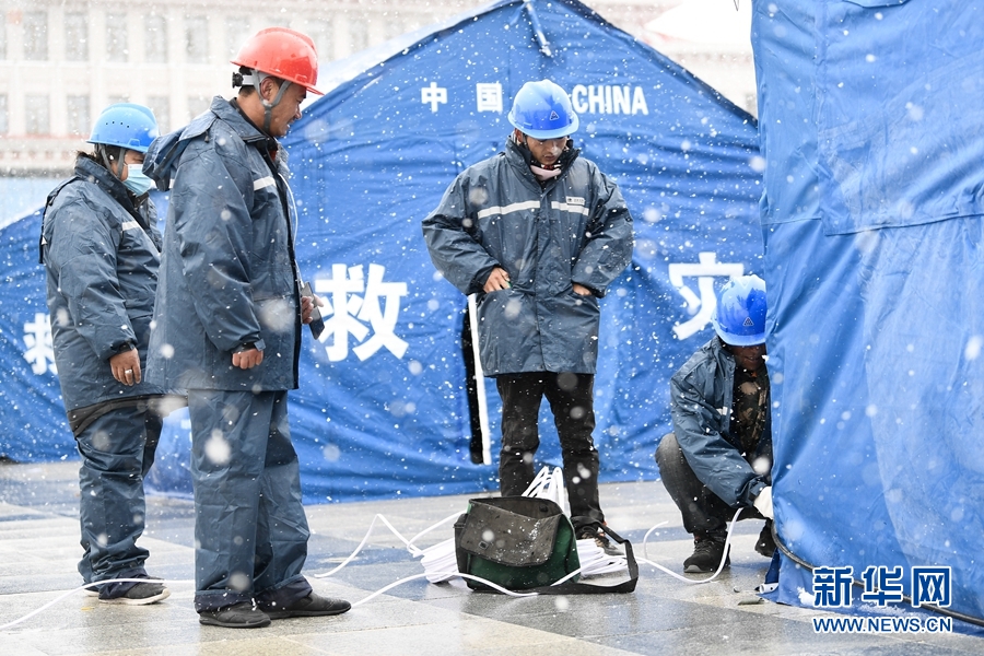 為了點亮災區(qū)首夜,國家電網青海省電力公司組織143名應急搶修人員,爭分奪秒為安置點通電。
