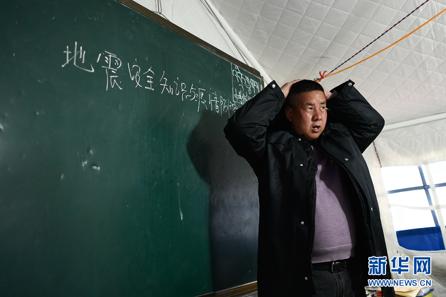 5月23日,李加才讓在九年級(jí)二班的主題班會(huì)上講解地震逃生知識(shí)。新華社記者 張龍 攝