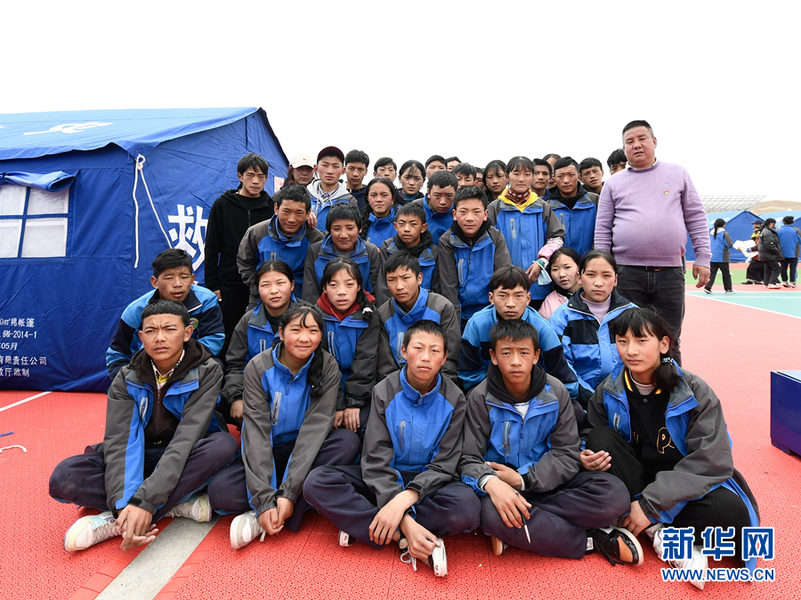 5月23日,李加才讓和學(xué)生們?cè)诂敹嗫h民族寄宿制中學(xué)帳篷教室旁合影。新華社記者 張龍 攝