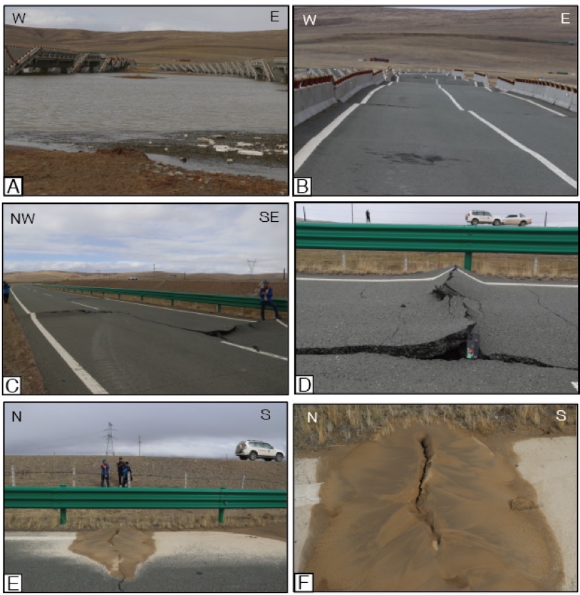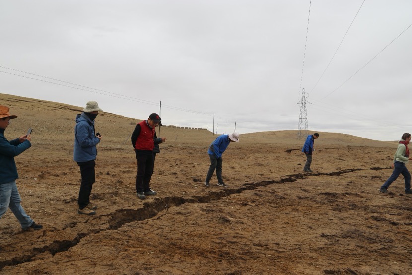 應(yīng)急考察隊(duì)相關(guān)負(fù)責(zé)人介紹,考察隊(duì)在白瑪納村附近發(fā)現(xiàn)地震次生破裂多處,黃河鄉(xiāng)附近向北西二十多公里地表破壞較為嚴(yán)重,破裂帶整體走向近120度,沿線隨處可見張裂隙、砂土液化等現(xiàn)象,路旁電線桿傾斜嚴(yán)重。接近G214國道一處地表破裂切過公路形成最大左行位錯(cuò)量。根據(jù)野外現(xiàn)象觀察,斷裂具有左行走滑兼正斷的運(yùn)動學(xué)特性。