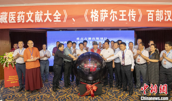 7月8日,四川成都,嘉賓共同啟動《藏醫(yī)藥文獻(xiàn)大全》《格薩爾王傳》百部漢譯工程。中新社記者 劉忠俊 攝