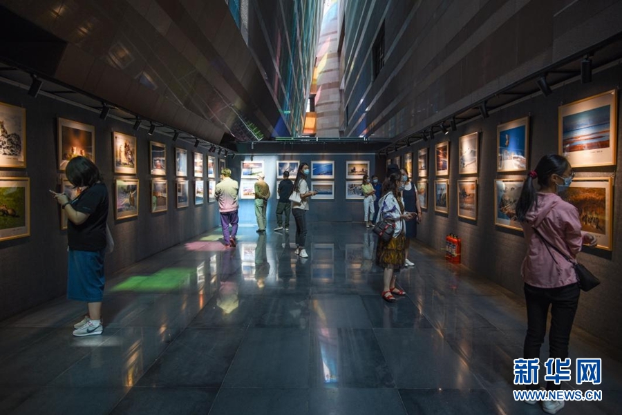 展覽現(xiàn)場,觀眾正在觀賞影像祁連山系列作品。新華網(wǎng) 齊雨萌 攝