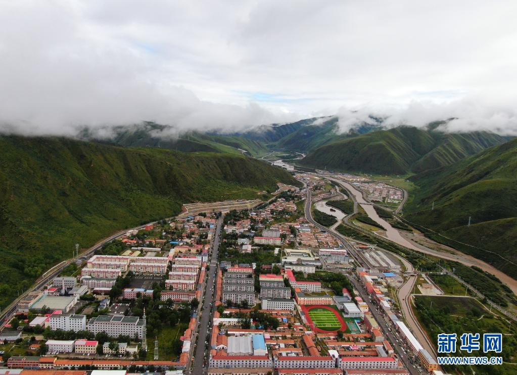 8月8日在青海省果洛藏族自治州班瑪縣境內拍攝的縣城景色(無人機照片)。新華社記者 張龍 攝