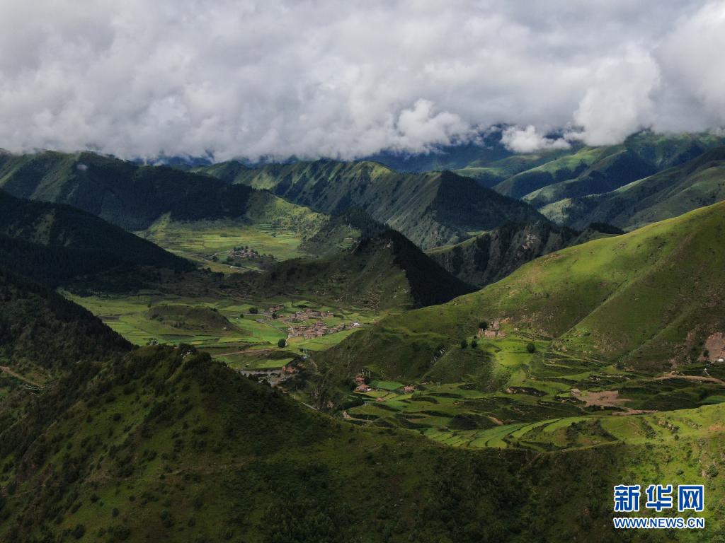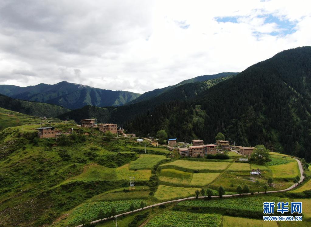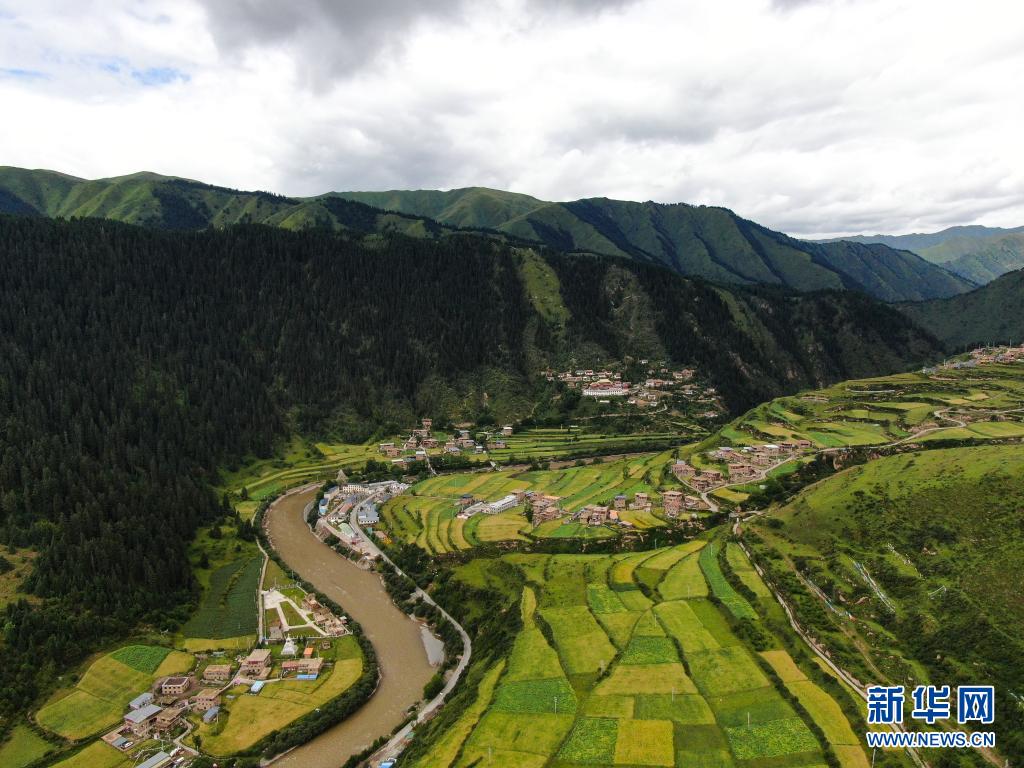 8月7日在青海省果洛藏族自治州班瑪縣境內拍攝的村莊景色(無人機照片)。新華社記者 張龍 攝